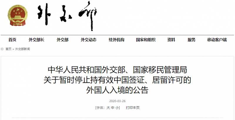 自2020年3月28日0時起 中方暫停持有效中國簽證 或留許可的外國人入境