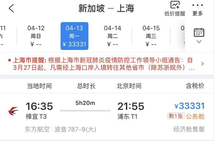 (新加坡飛上海浦東的票價高達¥33331,折合新幣約6666元,圖源:攜程旅行APP)