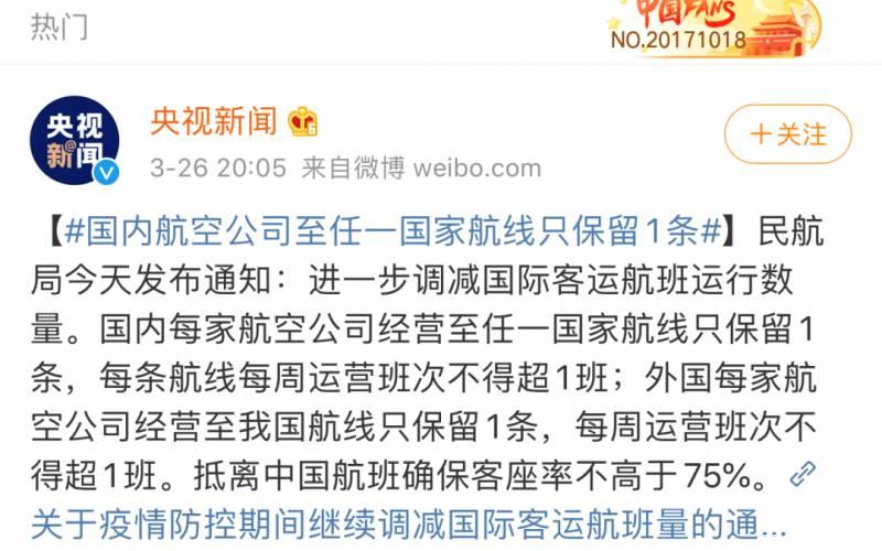 同一時間,中國民航局 也發布通知: 進一步調減國際客運航班運量 一個國家只能 保留一條航線!