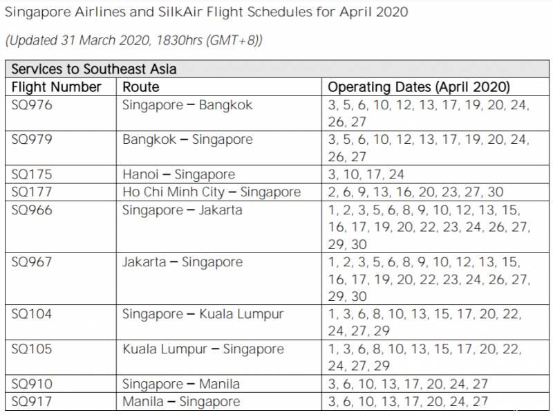 目前,除中國之外 新加坡航空 和勝安航空 還保留著哪些國際航線呢? 東南亞航線 根據新航3月31日 更新的數據可以看到: 東南亞方面,新航/勝安 還保留了 曼谷/河內/雅加達 吉隆坡/馬尼拉的航班