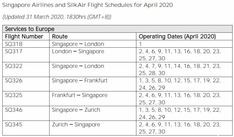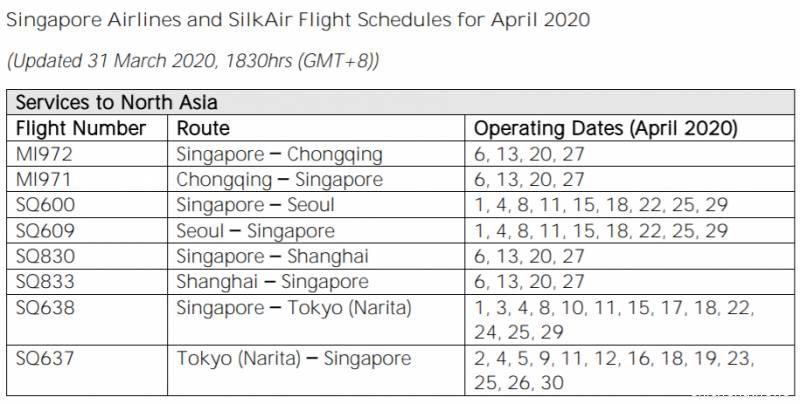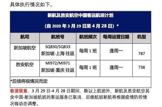 新加坡航空及勝安航空 3月28日緊急發布的公告稱 3月29日至4月28日期間 新加坡航空保留一個航班: 上海往返新加坡 (每周一 ) 勝安航空保留一個航班: 重慶往返新加坡 (每周一 )