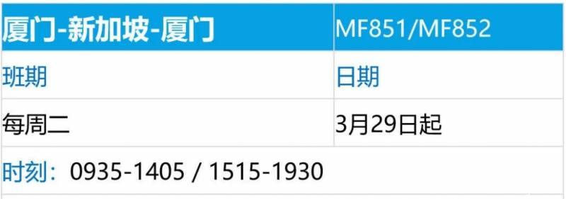 廈門航空自3月29日起 保留一個航班: 廈門往返新加坡 (每周二)