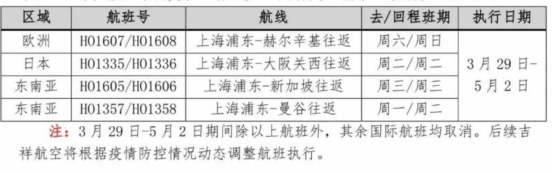 吉祥航空自3月29日~5月2日 保留一個航班: 上海浦東往返新加坡 (每周三)