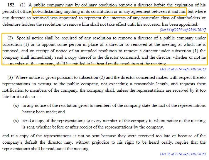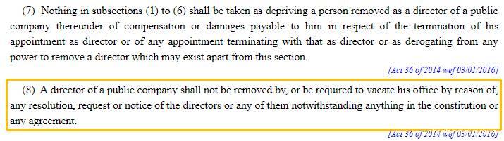 根據新加坡《公司法》第152(1)條,任何董事的免職,須在其繼任人獲委任後才生效。