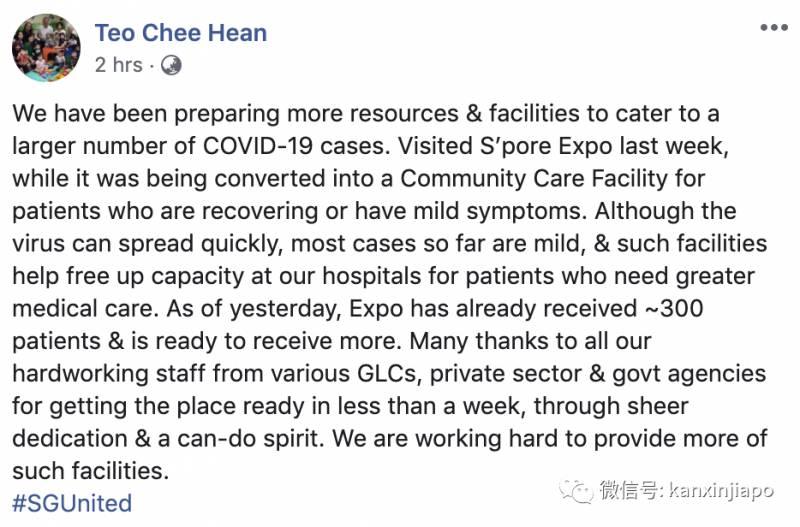 國務資政兼國家安全統籌部長張志賢和顔金勇走訪博覽中心後,在臉書發帖表示,新加坡政府一直在准備更多的資源和設施,來應對更大量的新冠病毒確診病例。