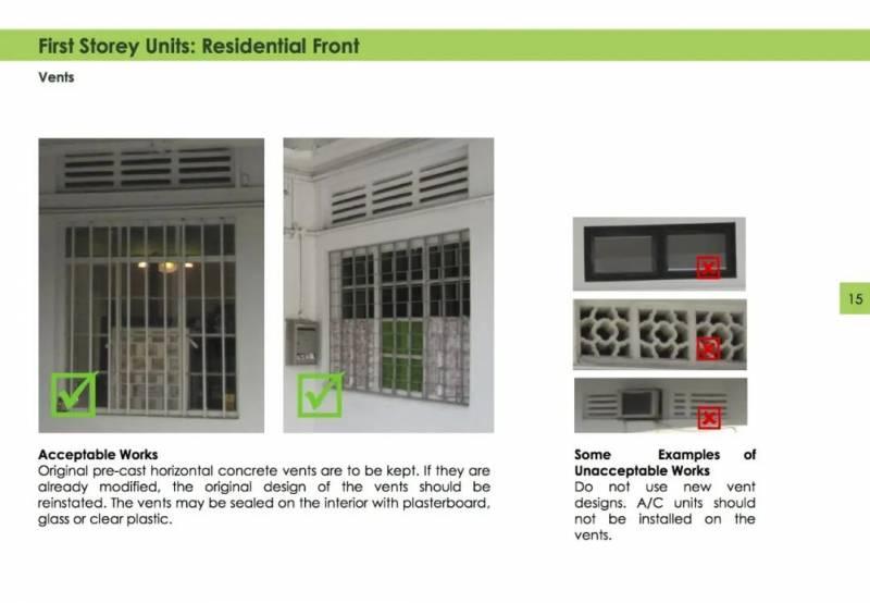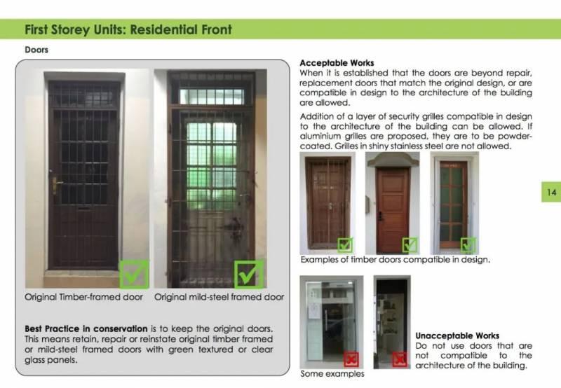新的住戶允許進行適當改造以適應現代需求,但必須在URA的導則之下進行,以確保建築遺産的特征得以保留。以下幾張圖是URA的修繕導則,包括建築關鍵保護要素內容,可以改造的方案,以及要避免的改造方案。