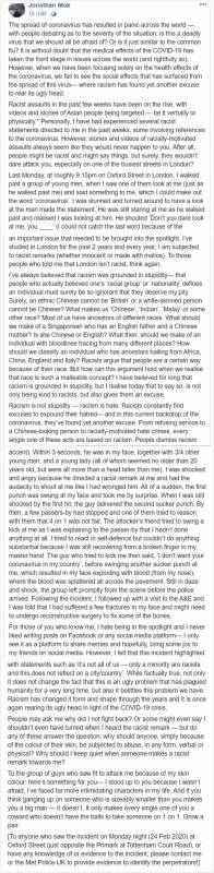 新加坡留學生疑因新冠肺炎遭毆打已不是第一次。3月份,新加坡留學生Jonathan Mok在Facebook上發文。文章中,他講述了自己在倫敦街頭遭到暴打的全部經過,並尋求事發當場的目擊證人,希望能夠得到幫助。
