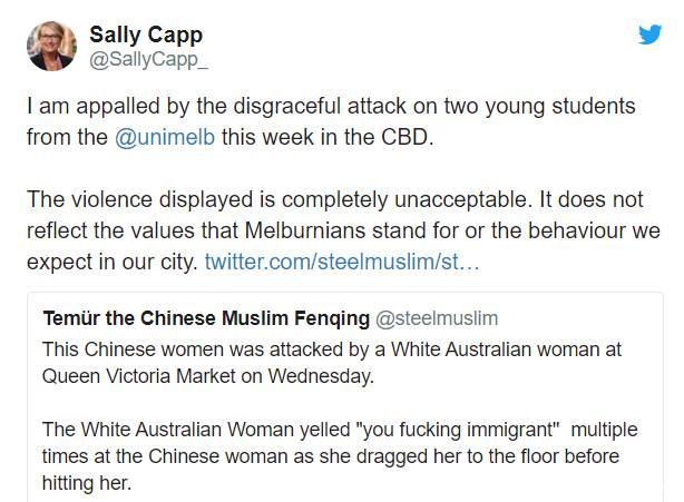 這件種族歧視襲擊案也驚動了墨爾本市長薩利·卡普(Sally Capp)。她在Facebook上轉發了新聞報道並寫道:“兩名年輕學生本周在中央商業區遇襲,我對這起襲擊事件感到震驚。這種暴力行爲令人完全無法接受。”