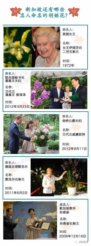 參加胡姬花命名儀式的名人既包括南非前總統曼德拉、已故英國王妃戴安娜、前英國首相撒切爾夫人、美國第一夫人勞拉、日本皇室成員等政治人物,也包括成龍、裴勇俊等演藝界人士。至今,新加坡政府已爲60多個“貴賓胡姬花”進行了正式注冊。由于新培育的胡姬花比較稀有許多名人之花還在實驗室裏培植,並沒有公開展示,更不能大規模栽種。種植在名人胡姬花園中的有近20種,其余的只能在照片中一睹芳容了。所有以名人名字命名的胡姬花都不能對外銷售。