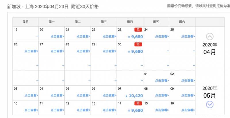 查詢東航的官網,會發現4月23日、5月7日、5月14日還有少量從新加坡飛回上海的機票待售,機票價格爲9680元,真是讓人大跌眼鏡!