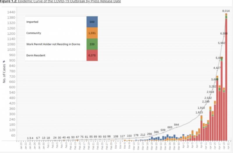 新加坡衛生部公告,在(4月20日)的新增病例中,有1369人是住在宿舍的工作准證持有者,32人是住在宿舍外的工作准證持有者。