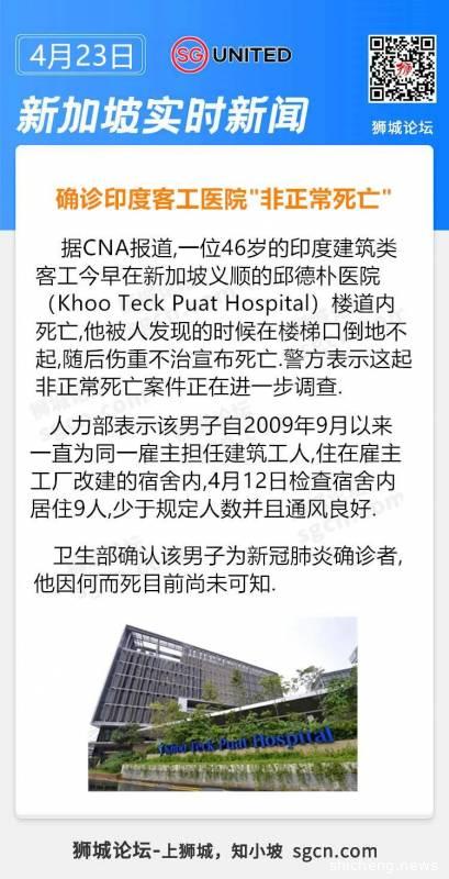 4月23日在KTPH邱德拔醫院死亡的46歲印度籍客工排除他殺,死因是由于“高空墜落”,死者是第8190起病例,本月19日確診感染冠病,他遺下妻子和三名介于6歲至16歲的女兒。