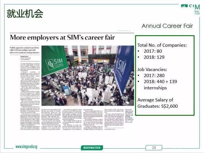 據最新統計,SIM畢業生工作3年左右,薪水可達到3500新幣+,每年臨近畢業,SIM都吸引了衆多知名公司來學校招聘。