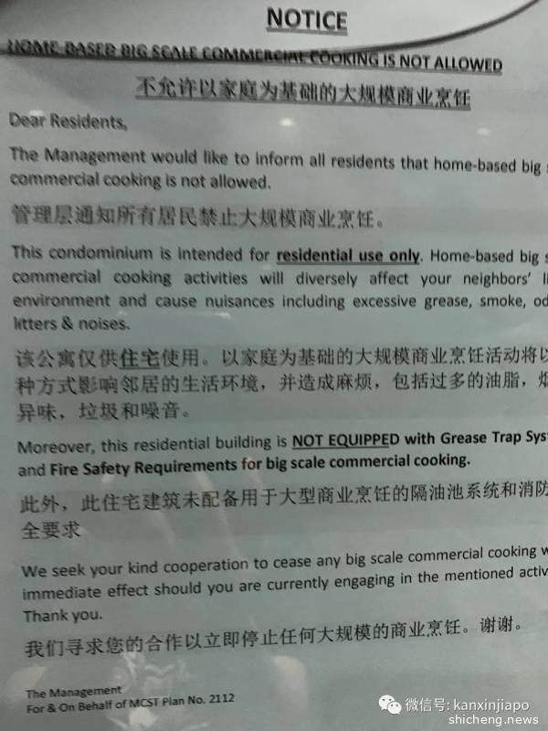 網友投稿給新加坡眼,某公寓張貼出的告示,明確說明禁止在家中進行“商業烹饪”。