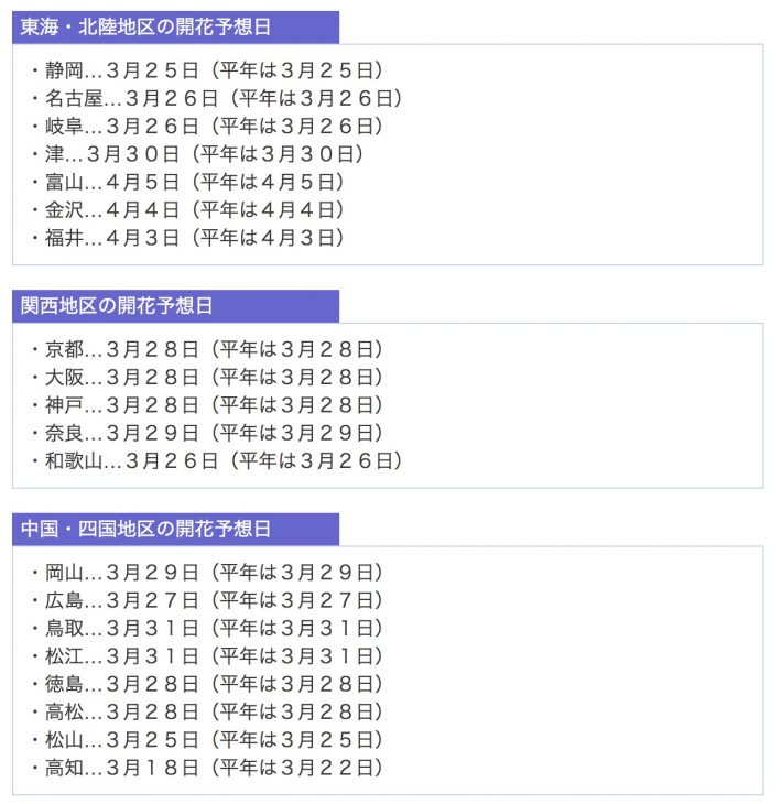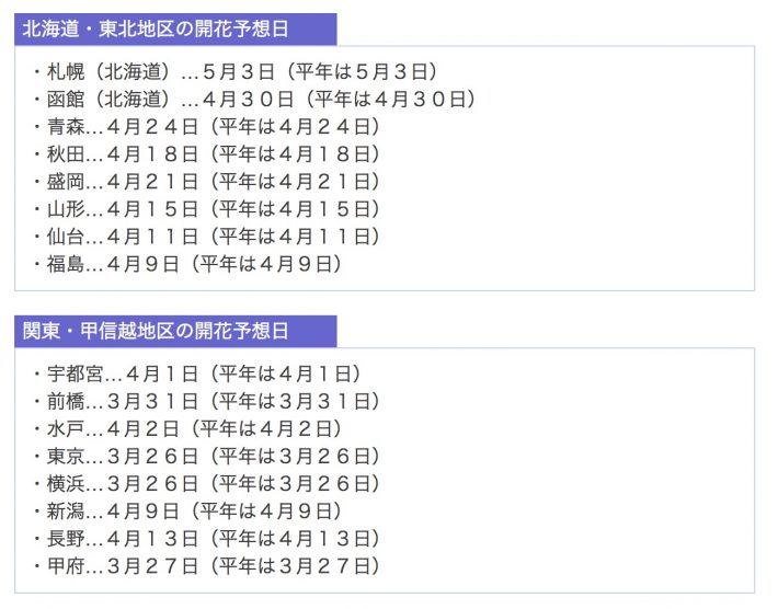 3月22日便有機會欣賞櫻花初開的美景,而櫻花滿開的勝景,則要分別等到3月29日及31日才能見到。福岡大阪、仙台的櫻花則緊隨其後依次綻放,北海道地區直到4-5月才會陸續開花。