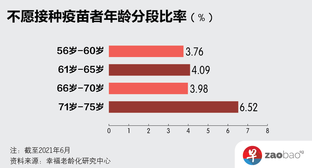 研究顯示,71歲至75歲的年長者最有可能對接種疫苗表示抗拒,不願接種者占比6.52%,這個年齡段的調查對象共有1211人。