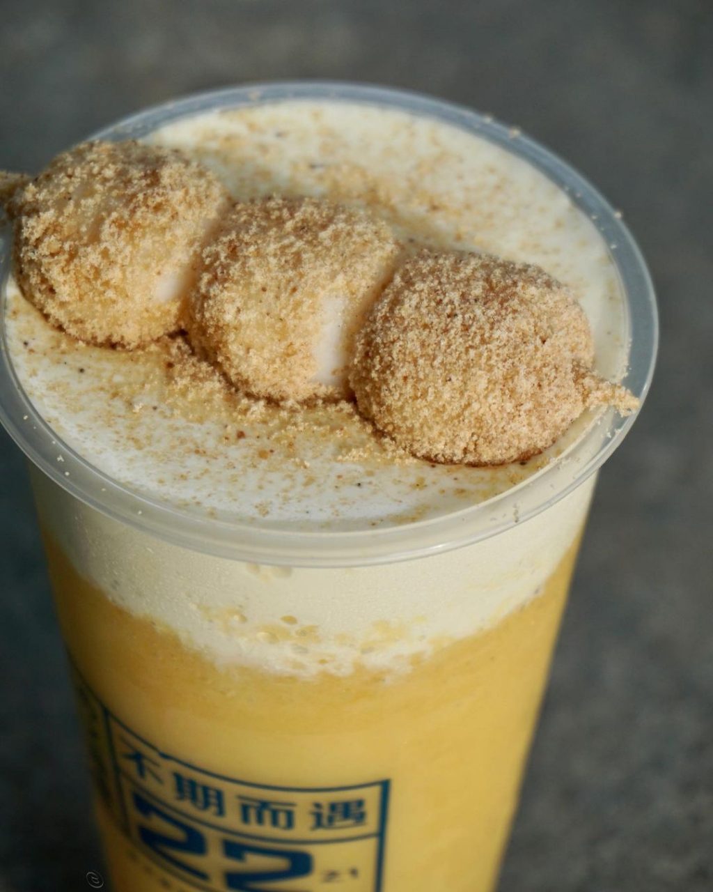 將麻薯丸子在豆乳奶蓋裏打個滾