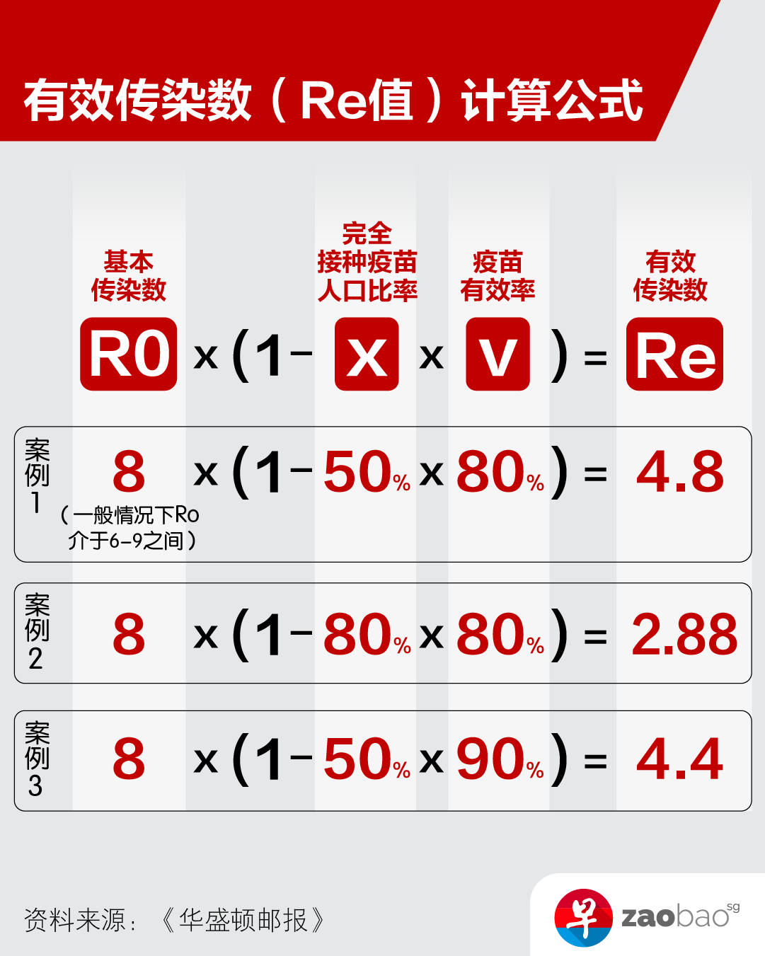 若疫苗有效率保持不變,將接種率提高到80%,那麽Re值可以降低至2.88(案例2)。若疫苗接種率保持不變,通過施打追加劑提高疫苗有效率至90%,Re值仍然維持在4.4(案例3)。