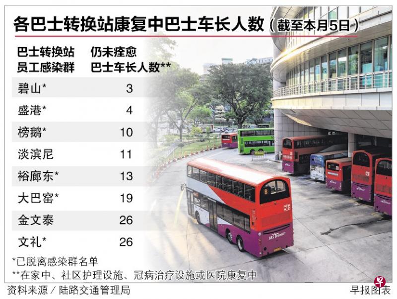 根據陸交局發言人提供給本報的資料,截至本月5日,碧山、榜鵝、盛港、大巴窯、裕廊東和文禮六個巴士轉換站已不再是感染群,只有金文泰和淡濱尼巴士轉換站還在感染群名單中。