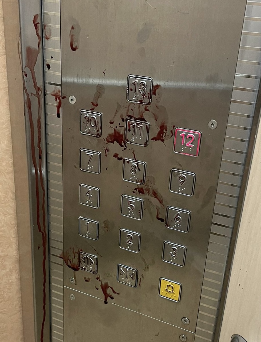 《新明日報》記者今早接獲熱心讀者撥打24小時新聞熱線後趕往現場時,發現血迹斑斑,許多戶單位的門前也沾染血迹。另外,電梯門外也有多個血掌印,按鈕及多層樓梯的扶手也都被染血,場景駭人。