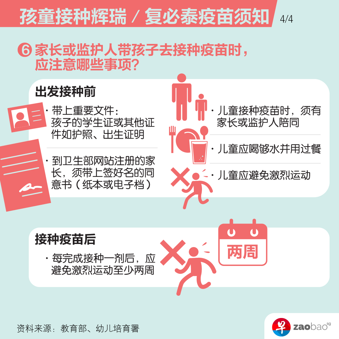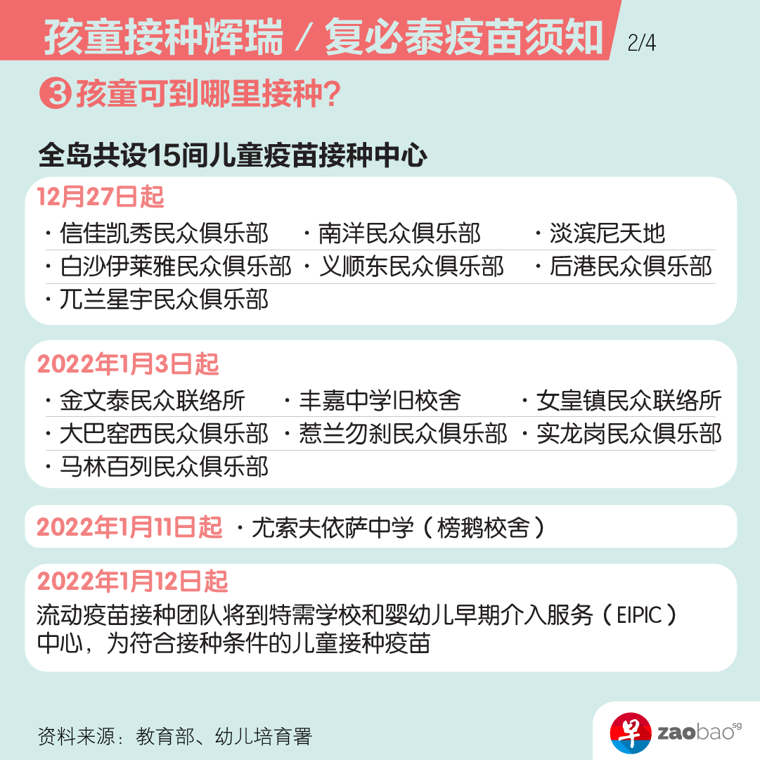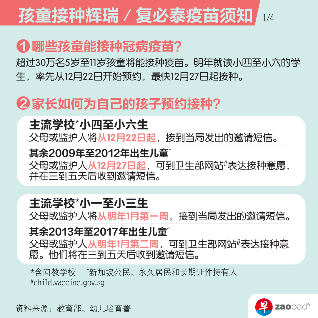 從明年1月第二周起,疫苗接種預約將開放給所有新加坡公民、永久居民以及持長期准證的五歲以上兒童。無論孩子就讀的學校類型,父母或監護人都可到衛生部的網站爲孩子注冊接種疫苗。