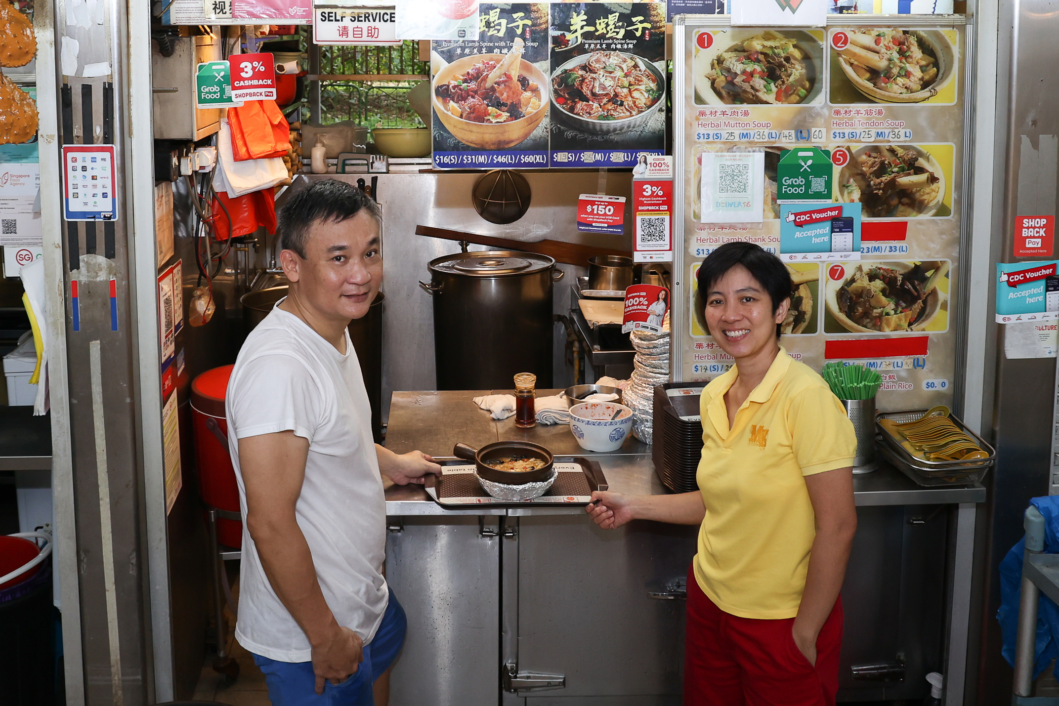 在巴西班讓熟食中心售賣海南藥材羊肉湯的邢愛薇(右)和丈夫黃守銘(左),希望租用食品廠的設備制作可常溫保存的羊肉湯,拓展海外市場。(蔡家增攝)