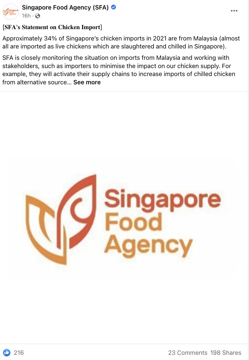 勢必會對新加坡的冰鮮雞肉市場造成影響