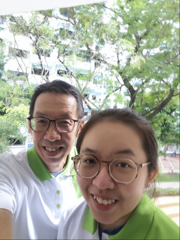 劉卓明(左)和女兒劉璟慧五年前開始成爲國立健保集團綜合診療所的義工,兩父女行善之余也擁有更多溫馨的相聚時光。(受訪者提供)
