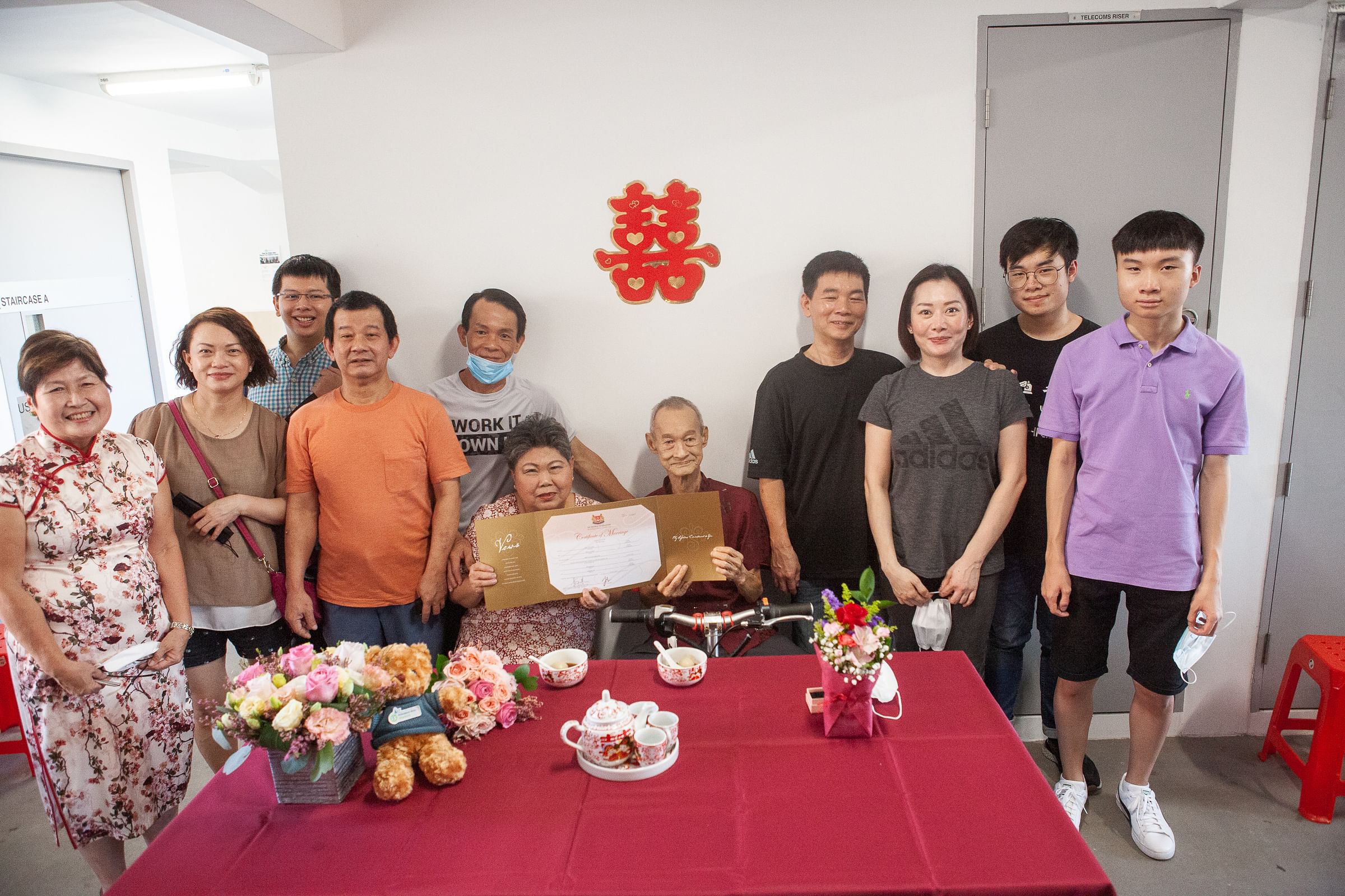 新加坡救護車圓夢隊的義工,爲老人家加速手續辦婚禮,兒孫、鄰居齊來送祝福。