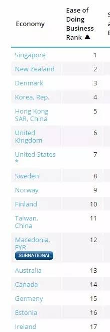 世界銀行專門設置了一個指標,做生意容易程度指數。