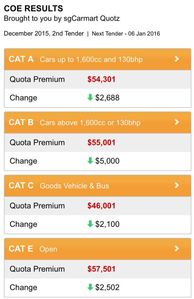 今年最後一次COE競價,大型及豪華車組(B組)的價格破天荒跌落4年以來的新低,與中小型汽車組(A組)的成交價僅相差700新元。身邊馬上要殺車的朋友竊喜,也有人認爲明年coe價格(俗稱車牌價)會延續跌勢准備再觀望一下,擇機入場。