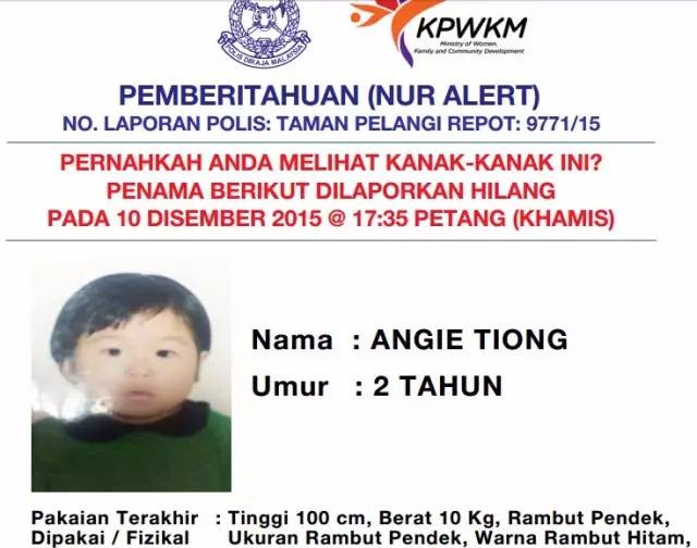 根據告示,該名女童張安琪(譯音,Angie Tiong)是于12月10日下午5時35分失蹤,地點是位于順利花園馬朱路(Jalan Maju)的麗雅酒店(Hotel Lia)。
