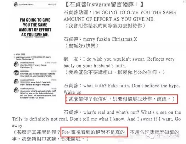但是,漸漸的,畫風越來越詭異,兩個人開始互撕:石貞善在ins上發了一張圖片,留言中爆了句粗口,有網友表示了不滿後,石貞善居然語出驚人,稱:“電視上看到的吳建豪都不是真的”
