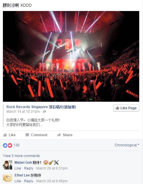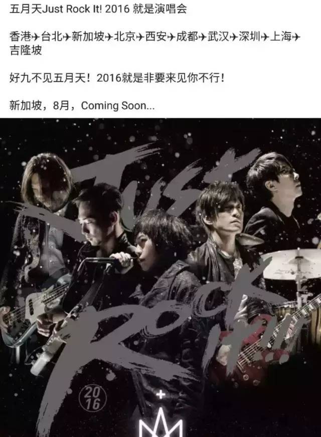 五月天要來新加坡啦,早過周傑倫,就在八月! 2021 年 3 月 10 日 幻想乡文字菌 有人已經迫不及待發布演唱會的消息了。 五月天新加坡後援會也在積極跟進,貌似很多粉絲很期待呢! 五月天的“JUST ROCK IT 2016 香港演唱會”,來臨5月就會亮相紅館。昨天正式發售10場演出的門票,就算規定了每人最多只能買四張門票,居然不到四個小時就賣完了,真夠火爆的。 看他們的社交媒體,一直交代粉絲要盡早存錢買演唱會的門票。有沒有人能告訴我,是他們的門票太貴,還是歌迷都大多是沒啥錢的窮學生呢? 或許也可以換個說法,五月天的粉絲們,你們都好年輕?! 相關文章:可愛義工帶老人們去濱海灣花園,搞笑春遊記高空俯瞰無敵海景房?新加坡濱海灣十一大酒店全方面指南什麽,你只知道金沙的無邊泳池?這才是新加坡最贊的十間酒店泳池!玩樂中心必選的酒店 — 聖淘沙島十大酒店盤點Chinatown在新加坡有個怪名叫牛車水 — 盤點新加坡牛車水十大酒店烏節路 — 新加坡最繁華購物區周邊的十大酒店 財經