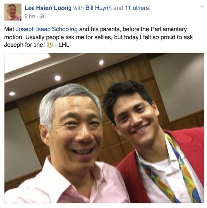 ▼李顯龍總理也在facebook激動又“失落”地說:以前都是別人找我自拍,這次是我找約瑟林自拍,我驕傲!