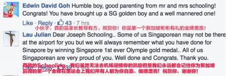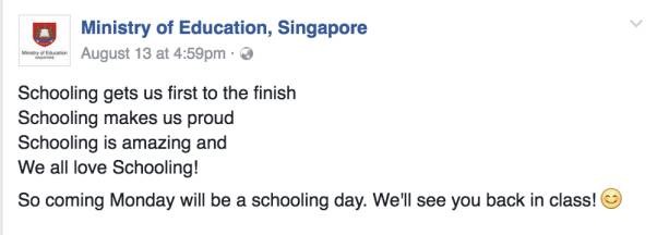 Schooling帶我們第一個到達終點,Schooling令我們自豪,Schooling很棒,我們都愛Schooling!所以下周一是Schooling日,我們在教室再見!(注:Schooling也有上學的意思)
