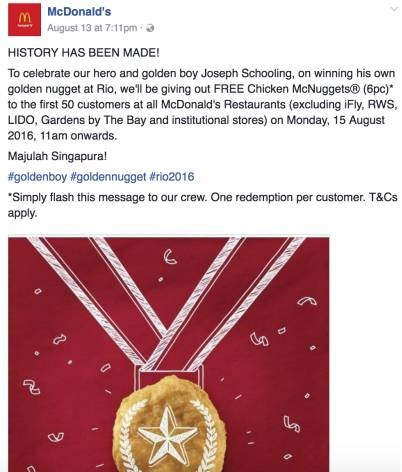 ▼爲了慶祝Schooling的成就,麥當勞居然在今天上午免費送雞塊!