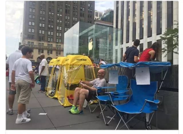 美國的果粉更瘋狂,早在8月中旬就開始排隊了!發布會還沒有開始,位置已經占好。紐約第五大道門店前的隊伍已經一眼望不到邊了。因爲排隊周期長,美國果粉的裝備更加齊全亮眼,驚現帳篷和睡袋,大家死磕到底的決心一展無遺。