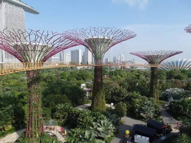 濱海灣花園中有一群擎天大樹(Supertrees),就在金沙酒店的正後方。一共18棵樹,高度都在23米以上,其中最高的樹有50米高!介于兩棵擎天大樹之間還有一個空中走道,站在上面便可以鳥瞰花園全景。