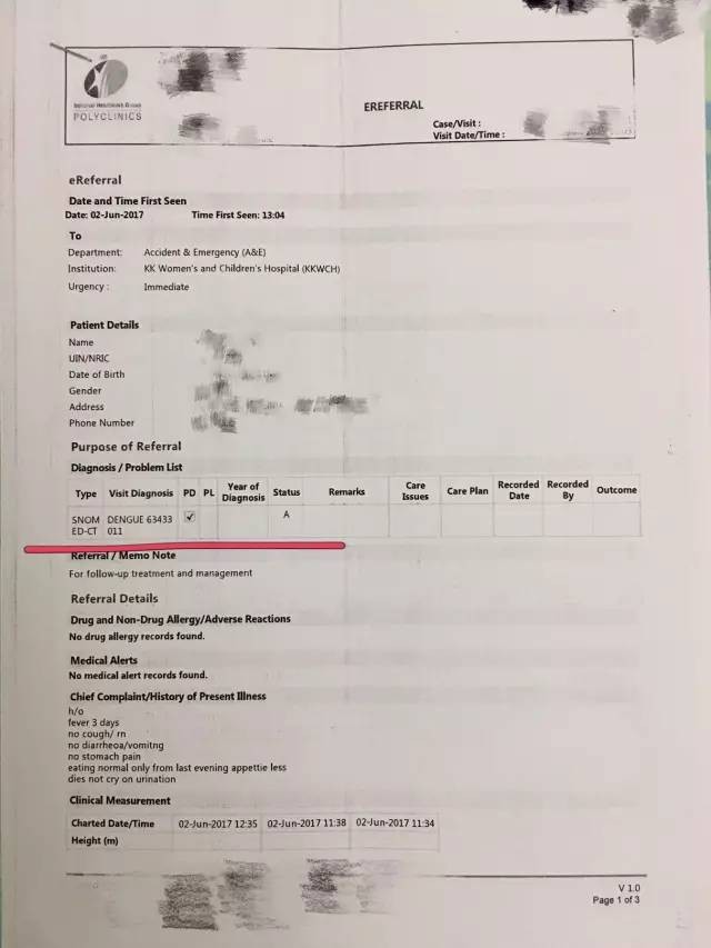 我和婆婆面面相觑,心說最近也沒被蚊子咬過,怎麽就疑似登革熱了呢?問醫生接下來該怎麽做,醫生讓第二天再去驗血,血小板再降的話說明是登革熱,要轉診到KKH。我心想不如直接轉診去KKH—-萬一真是登革熱,也省得再跑一次醫院。于是要求醫生開了轉診信,第二天直接去KKH。