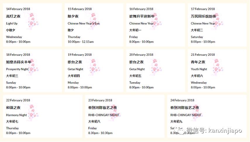 今年,春到河畔的主題爲“溫馨家園有你有我”,在2018年2月14日至2月24日期間舉行。特別是在2月23日和24日傍晚,主辦方還會帶領大家跳場新加坡最嗨的廣場舞哦!