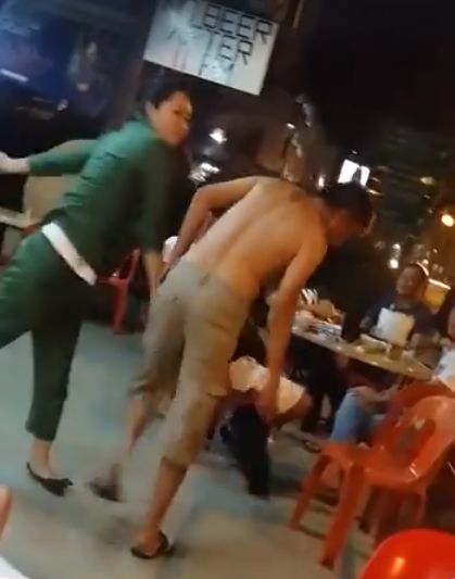 這時,旁邊一位貌似是白衣女子姐妹的綠衣女子拿起玻璃杯,duang一下朝男子的腦袋砸去,相當女漢子。