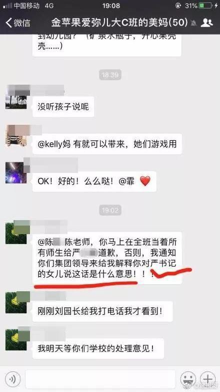 但是家長們並不買賬,一致的意見卻是:該收拾一下這些人了,必須要給園長說明家長的態度,讓嚴夫人給老師道歉。一個辣媽直接@嚴夫人說:好大個事嘛,不知道從自己身上先找原因,一來就說什麽嚴書記的女兒,你咋不讓嚴書記自己來說呢,真的是,說這些來嚇唬誰呢,安?