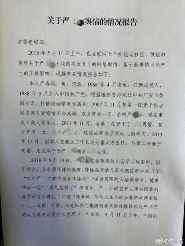 兩天後,網上還出現了署名爲“廣安市委副書記嚴春風”寫給省委組織部的情況說明,稱其已與“嚴夫人”離婚,還特別聲明是因爲她在嚴書記援藏期間出軌所致。爲了自證清白,嚴書記也是豁出去了。不過,如此“甩鍋”似乎也成了一種套路。