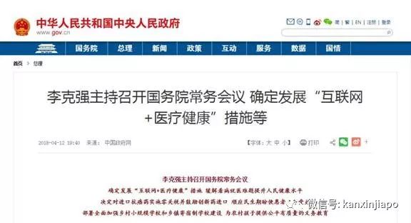 2018年4月12日中國國務院常務會議,確定發展“互聯網+醫療健康”措施,緩解看病就醫難題、提升人民健康水平。 政府要求有關部門調整優化投資結構,把固定資産投資更多投向基礎信息等領域,加快“互聯網+醫療”建設,讓優質醫療教育等資源惠及更多人民大衆。