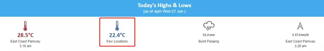看到了吧,新加坡今天最高溫度是28.5℃,而最低溫度是22.4℃!!!要知道新加坡曆史最低溫是1989年的19.4 °C!