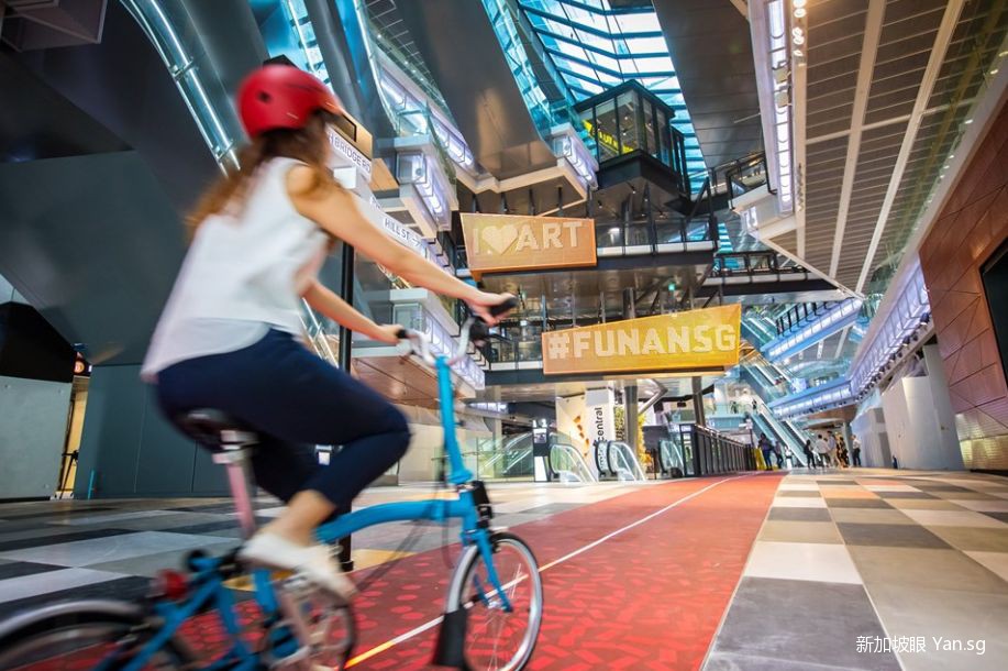 福南數碼生活廣場的地面層擁有室內腳踏車道!車道長200米,可以從一樓的橋北路大門一路騎到商場後方的腳踏車中心。這是新加坡第一家可以邊騎車邊逛的商場!