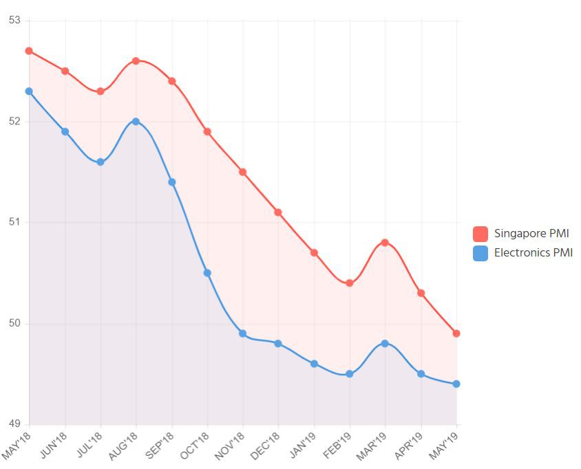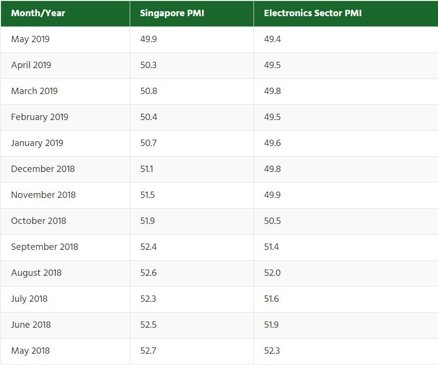 當PMI指數低于50%,尤其是非常接近40%時,則有經濟蕭條的憂慮。一般在40-50之間時,說明制造業處于衰退,但整體經濟還在擴張。雖然新加坡現在的PMI指數接近50%,但與去年同期相比,已經下降2.6%。