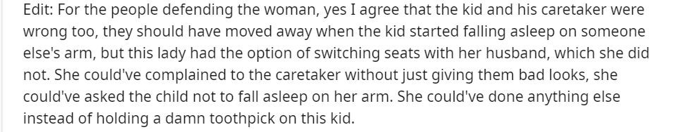 黑衣阿姨的老公于是建議和她換個座位。可阿姨氣不過,不肯換座位,拿出牙簽尖對著那個孩子。孩子要是打瞌睡的時再靠過來,就會被牙簽刺到。