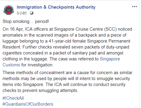 這不,今天(4月18日),新加坡移民與關卡局發布了貼文,說有一名41歲女性新加坡永久居民因爲涉嫌帶幾包漏稅香煙入境被海關人員發現,現已經被移交給關稅局處理。